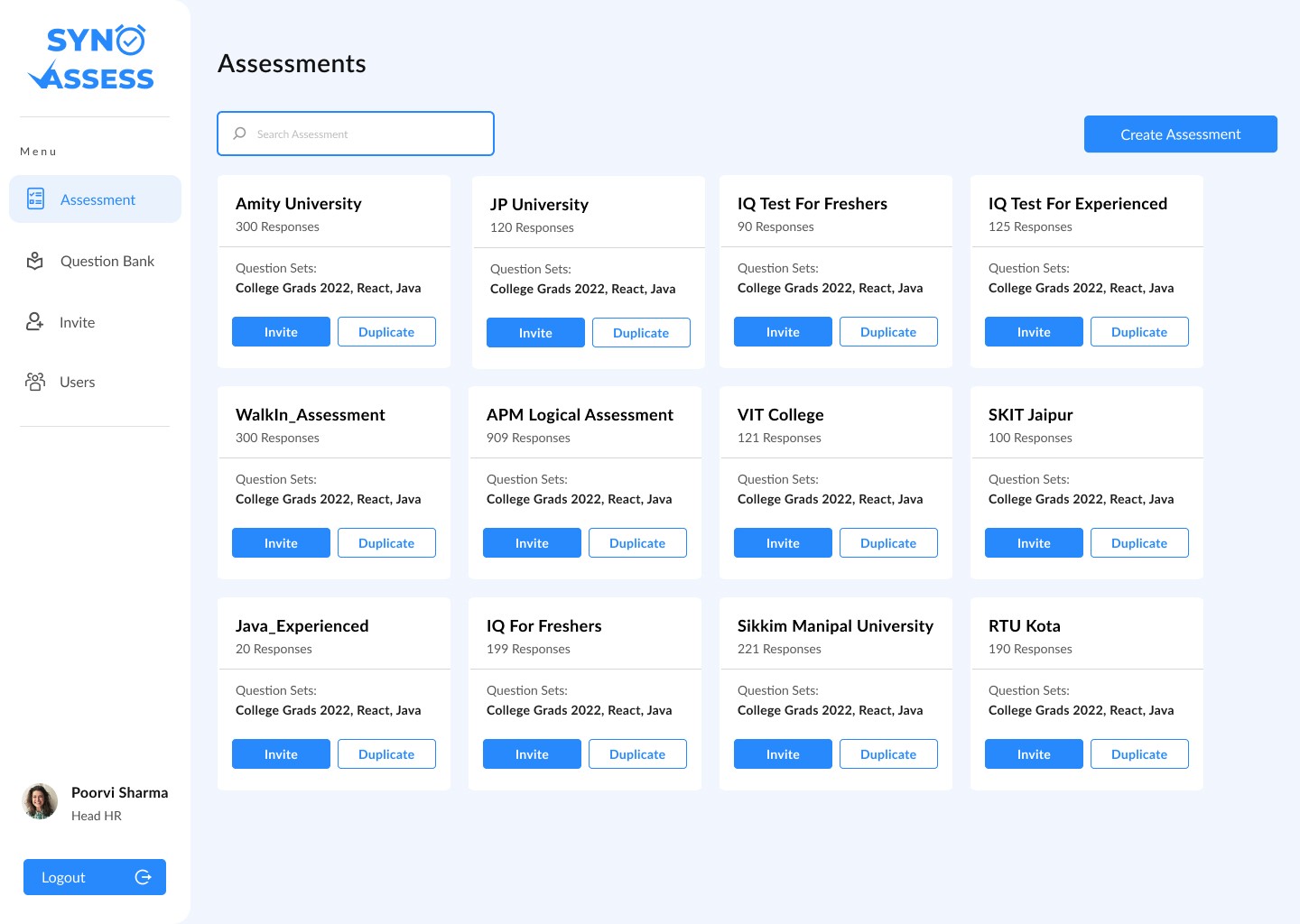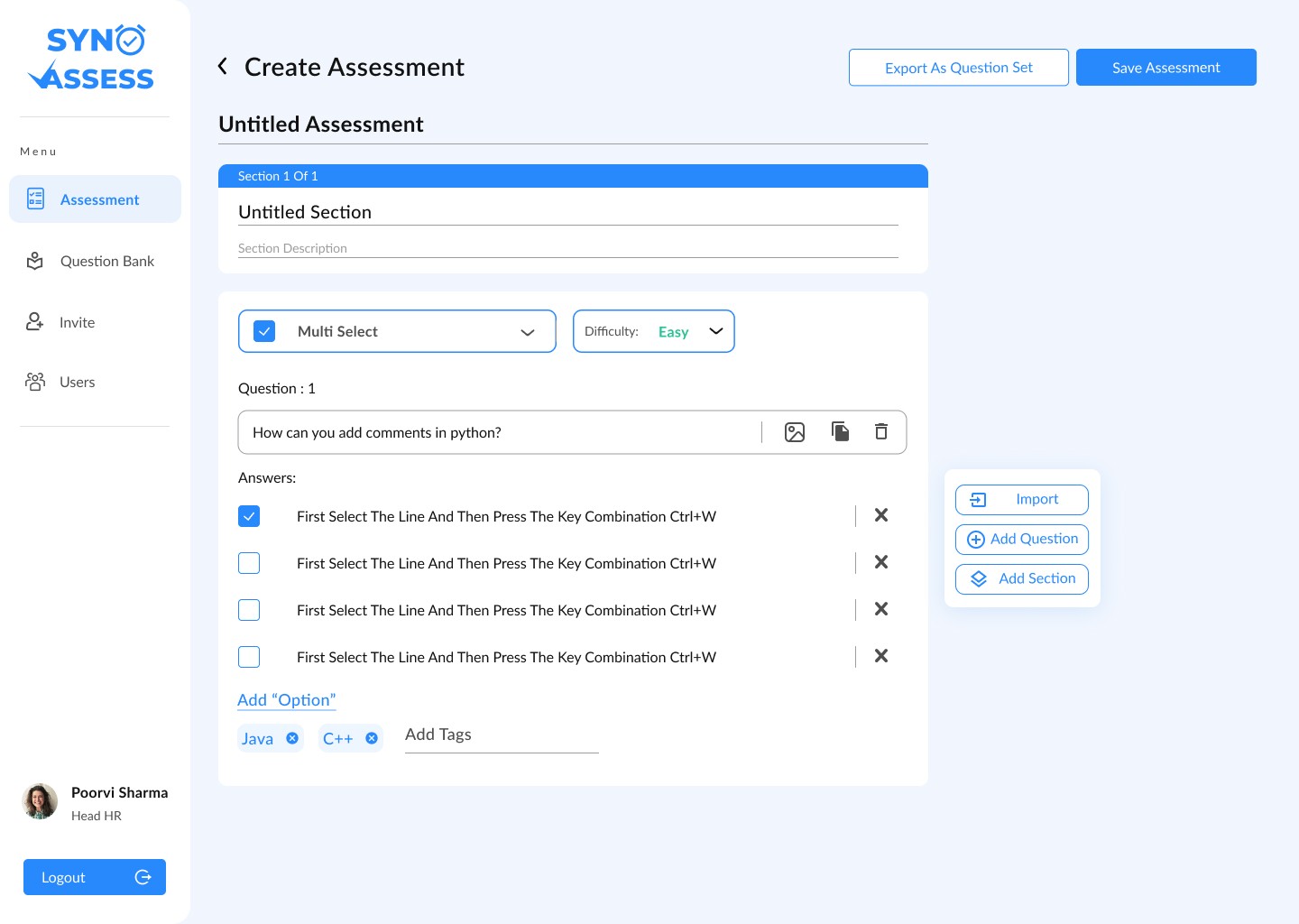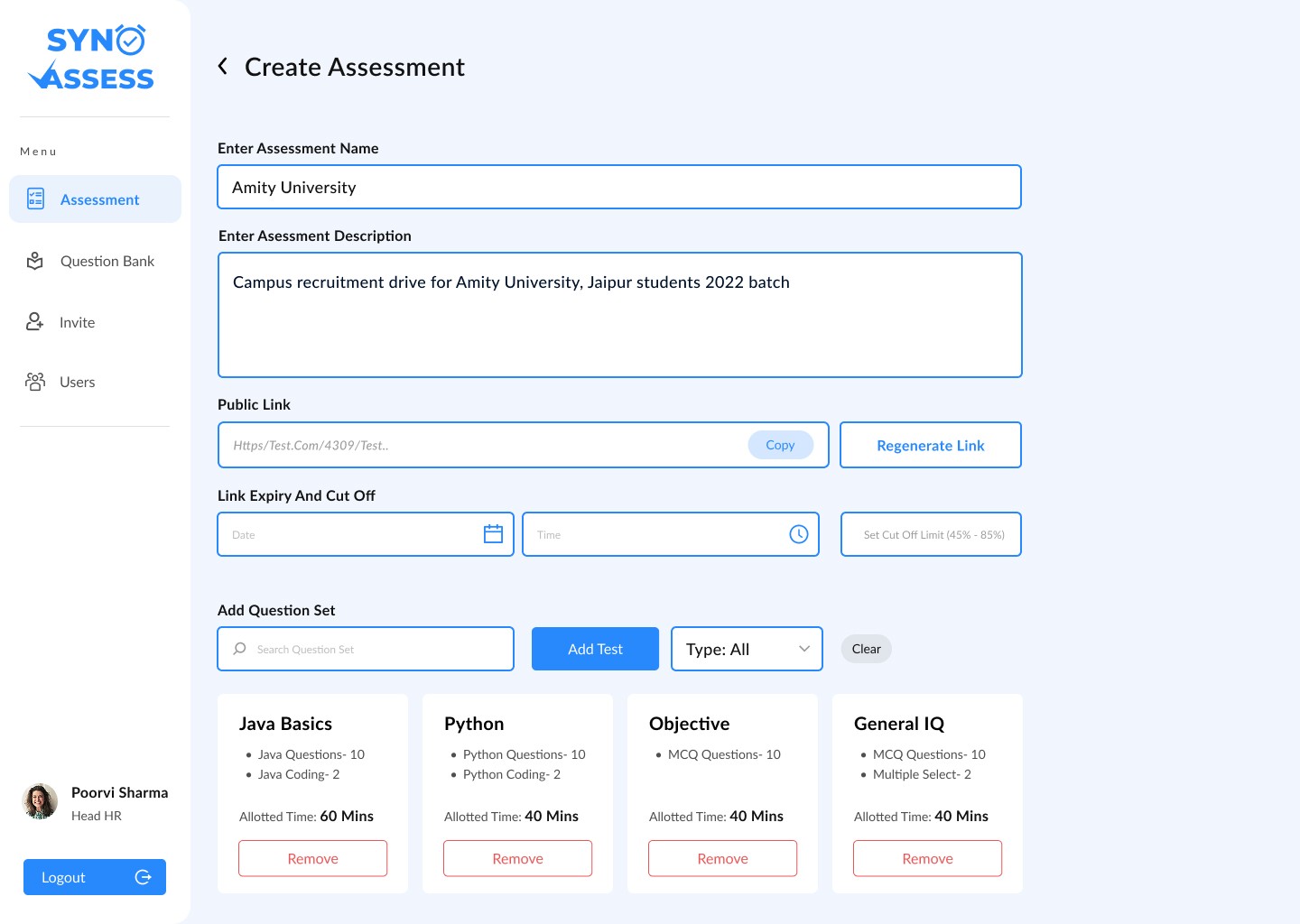 A key business goal was to create a robust question bank. I designed the interface for this library, allowing admins to store, categorize, and analyze questions based on difficulty, which could then be used to build preset and custom assessments.