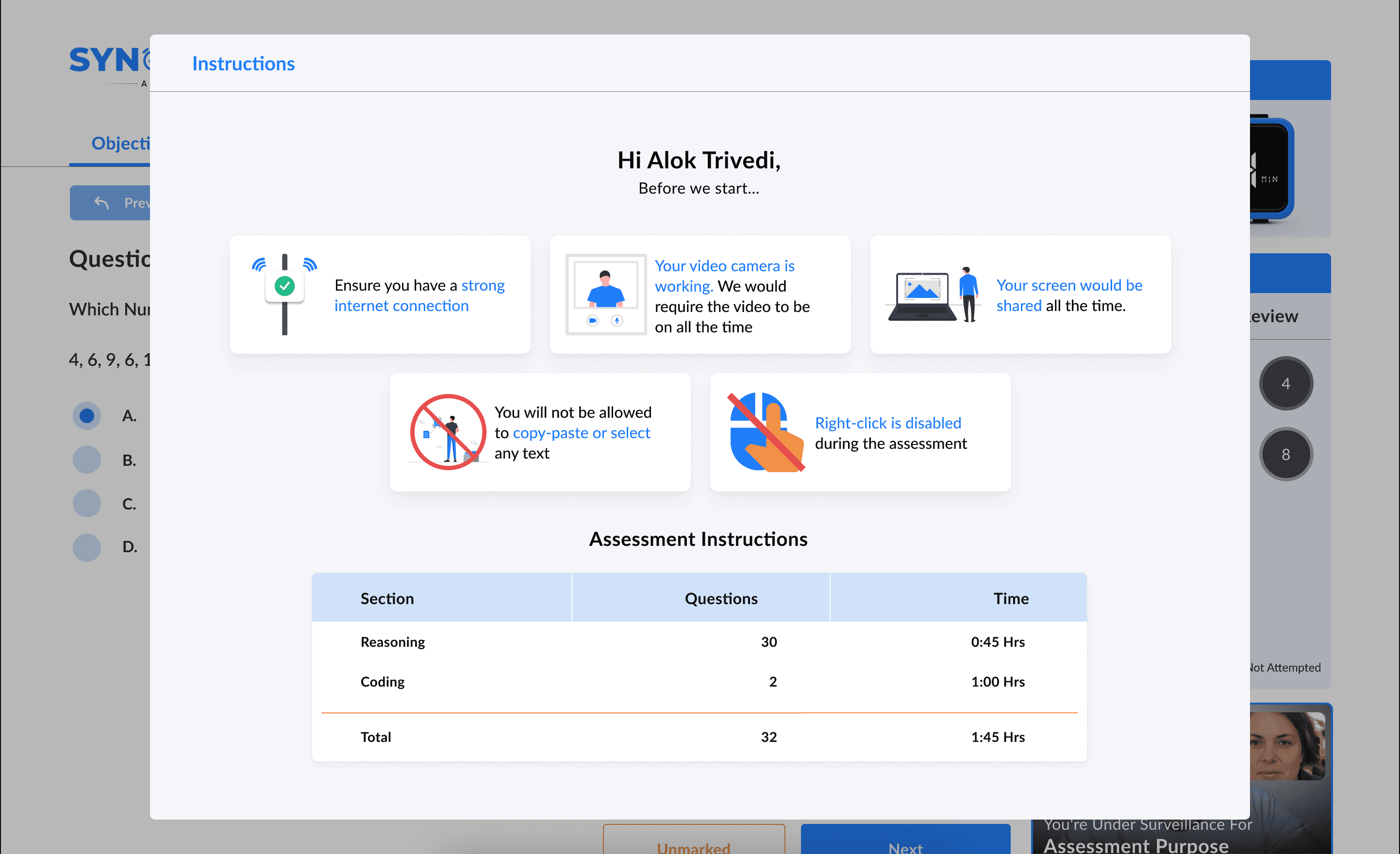 For the student-facing side, the focus was on clarity and security. The final design featured a prominent timer, a simple question navigator, and built-in proctoring features like video surveillance to ensure integrity. Before starting, users are met with a clear instruction popup detailing all the rules, such as a stable internet connection being required and copy-paste being disabled.